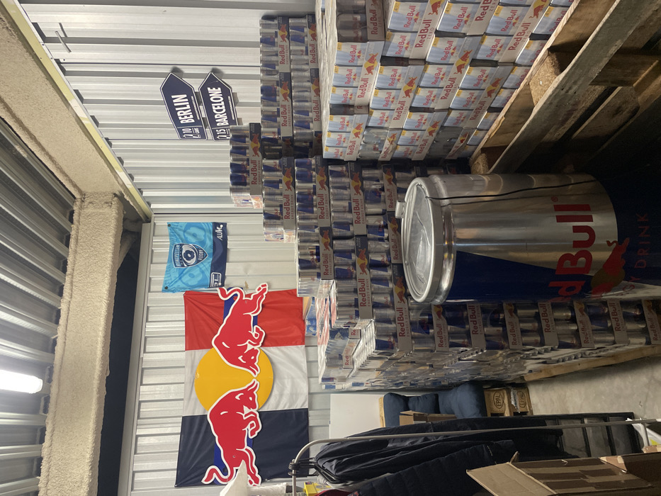 The image depicts an indoor storage or utility space characterized by light grey corrugated metal walls and an exposed metal ceiling structure, with a beige fibrous material covering a horizontal beam. Numerous cases of Red Bull energy drink are systematically stacked on wooden pallets, forming large product walls on the right and extending into the background. Both standard Red Bull and Red Bull Zero Sugar variants are visible. In the foreground, a large, cylindrical replica Red Bull can serves as a waste bin with a hinged lid. On the left wall, three banners are displayed: a French tricolor flag (blue, white, red) featuring an overlaid Red Bull logo with two red bulls charging a yellow sun disk, positioned prominently. To its right, a light blue flag with "MONTPELLIER RUGBY" and an associated logo, along with "AUK", is visible. Higher on the right wall, two superimposed directional signs point towards "BERLIN" (2h10, 2 CANS) and "BARCELONE" (2h15, 2 CANS). In the left foreground, a metal garment rack holds several dark jackets or coats. Below it, cardboard boxes rest on the floor. Towards the left background, a makeshift seating area is present, composed of a dark blue cushion atop stacked wooden pallets, one of which visibly displays the "EPAL" stamp, indicating a Euro pallet. The scene suggests a Red Bull-sponsored event or team facility, or a storage area, located in Montpellier, France, given the specific rugby club identified on the flag. No individuals are present.