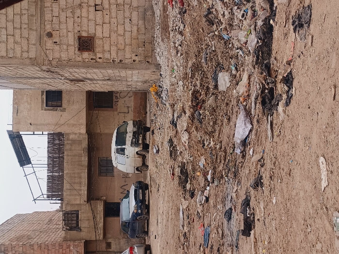 The image depicts an unpaved urban area in Kafr Sousa Municipality, Syria, characterized by extensive debris and dilapidated structures under an overcast sky. The foreground is dominated by uneven, light-brown soil heavily strewn with various forms of refuse, including plastic bags, fabric scraps, cardboard, and general litter, forming several small mounds. In the midground, two vehicles are parked on the unpaved ground. To the left, a dark blue sedan, exhibiting visible wear and a damaged front bumper, faces slightly left. To its right, a white panel van, also appearing worn with damage to its front bumper area, is similarly oriented. The background consists of several multi-story buildings. On the left, a partial view of a reddish-brown brick structure is visible. Centrally, a two-story light-brown concrete building features multiple windows, some barred, and wires running along its facade. Graffiti is present on its lower section, with discernible letters such as "M+K" and "L+S." The rooftop of this building hosts a metallic frame structure supporting solar panels and a dark, slatted railing or privacy screen. To the far right, a light-colored cinder block or brick building displays a single small, barred window. No people are visible in the scene.