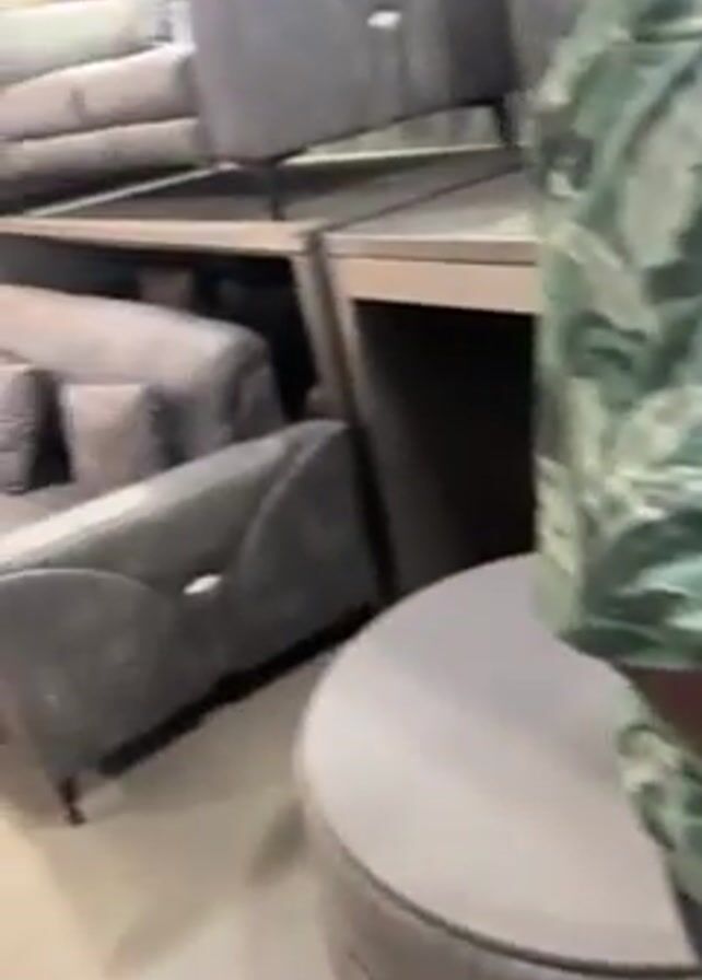 A person wearing a green and white patterned shirt and gray pants is holding a smartphone and recording a video of a large showroom filled with sofas of various colors and designs. Some sofas are stacked on shelves. The lighting in the showroom is bright. Another person can be seen at the back of the showroom.