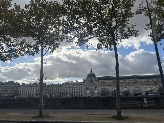 The image depicts the Musée d'Orsay in Paris, France, viewed from across the Seine River