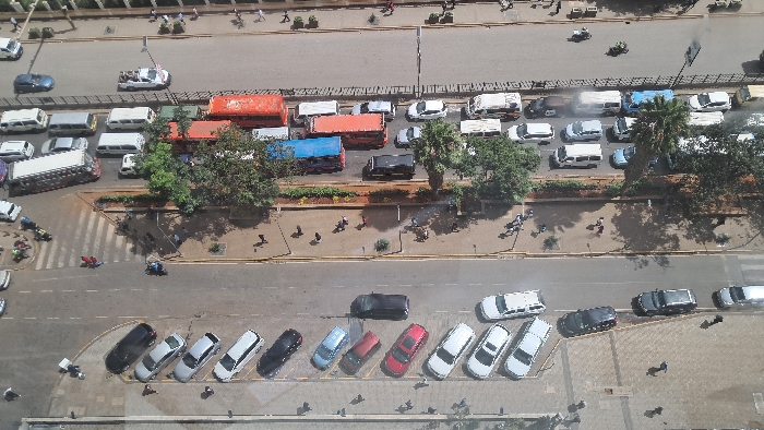 An aerial, high-angle photograph depicts a busy urban street scene on Moi Avenue in Nairobi, Kenya
