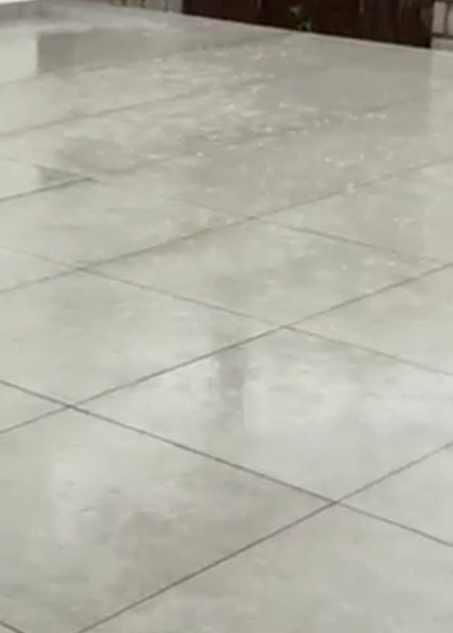 It is raining hard outside a modern-style building. The building features gray floor tiles, a stone fence, a wooden gate, and white walls. A tall pine tree is in front of the building. The surrounding landscape is green with dense trees and hilly terrain. The sky is overcast, contributing to the somber, rainy atmosphere.