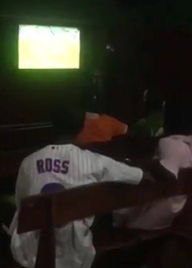 People are watching television in a dark room. The television screen has a bright, unclear image. Several people are sitting on wooden benches facing the television. One person wears a white baseball jersey with "ROSS" on the back. An orange shirt can be seen on the back of someone in front of the person in the jersey. There is a ceiling fan visible in the darkness above.