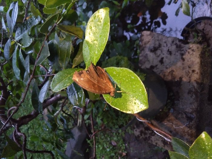 A brown butterfly with partially damaged wings rests upon a vibrant green leaf, covered in visible water droplets, suggesting recent precipitation. The leaf exhibits a subtle variegation, with lighter green or yellowish areas. This leaf is part of a potted plant, positioned above a textured, light-colored rock structure. To the right, a darker area reflects light, indicating a body of water or a wet surface. The background consists of dense, dark green foliage, some of which appears to be from a twisted, gnarled vine or tree branch. The scene depicts a small, verdant garden area, likely a backyard, within the city of Turmero, Venezuela.