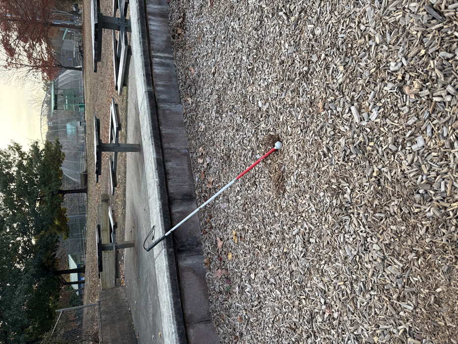 A red-and-white long cane lies on the ground next to a gray concrete border. Wood chips cover the ground, scattered with a few leaves. Several picnic tables are visible on the concrete surface, aligned in a row. Behind them are trees with some bare branches and a distant fenced area, possibly a baseball field. The scene suggests a park or recreational area on a cloudy day.