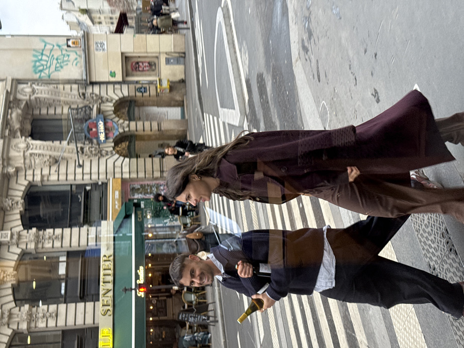 The image depicts an urban street scene in the Sentier district of Paris, France, identifiable by a "LE SENTIER" sign on a café awning and a classic circular "METRO" sign on a building facade. In the foreground, two individuals are walking from left to right across a zebra-striped pedestrian crosswalk. The male, on the left, has short dark hair, wears a light shirt under a dark knit sweater, and dark trousers. He smiles directly at the camera, holding two bottles—one light-colored, one dark—in his left hand. The female, on his right, has long dark wavy hair, wears a long, dark plum or burgundy double-breasted coat over dark brown trousers, and looks forward with a slight smile. In the midground, to the left, is a Parisian café with patrons seated at outdoor tables under a green awning. To the right, a multi-story stone building with ornate architectural details displays the "METRO" entrance sign. Green graffiti is visible on the upper corner of this building, along with a small pixelated green artwork. The background shows further blurred city activity and buildings under overcast daylight.