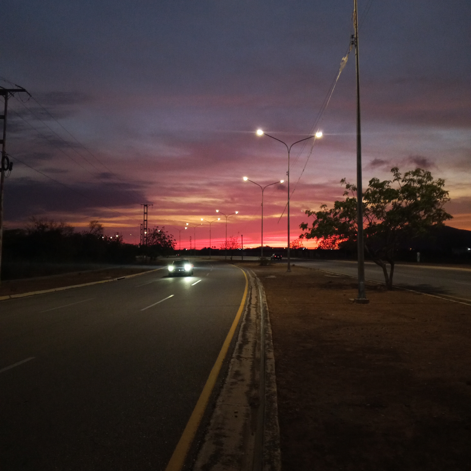 A low-angle, nighttime view shows a car with headlights on traveling along a dark asphalt road with a yellow painted shoulder line. To the right of the road is a dirt shoulder lined with streetlights and an isolated tree. A brilliant red and pink sunset is visible on the horizon behind the streetlights. Power lines and poles are visible on either side of the frame.