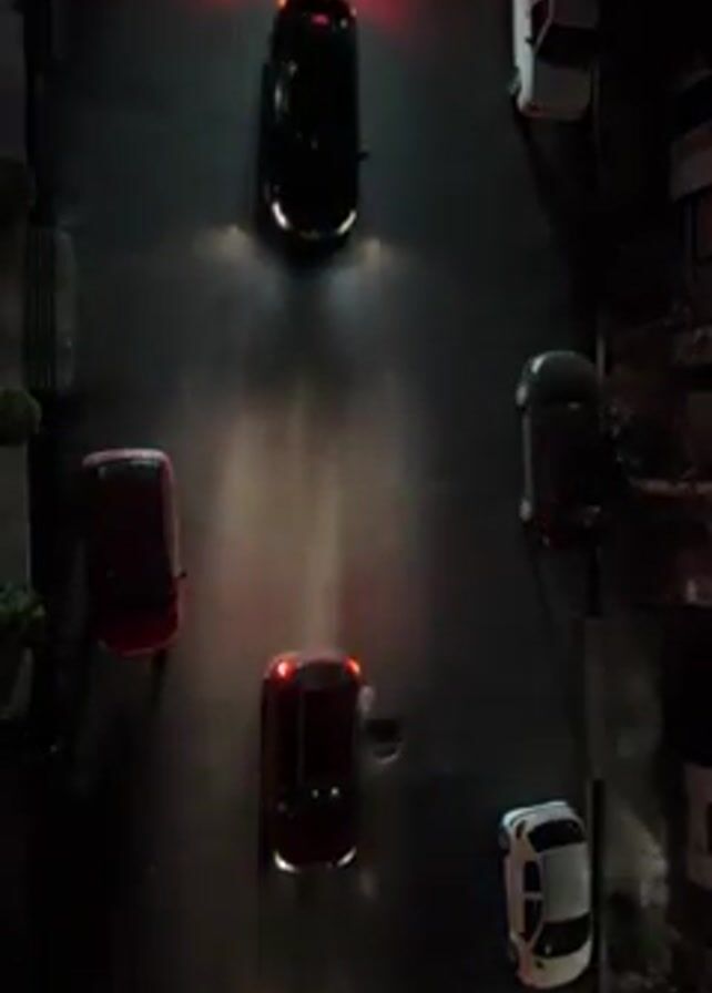 From an overhead perspective, a dimly lit street at night is shown. Parked cars line each side of the road. The headlights and taillights of cars in the middle of the street cast light onto the asphalt. A sound of someone calling to prayer is faintly audible.