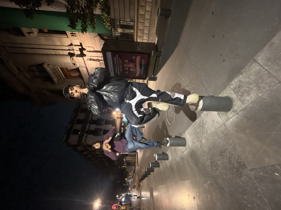 Two individuals pose on a sidewalk at night in Mexico City, Mexico