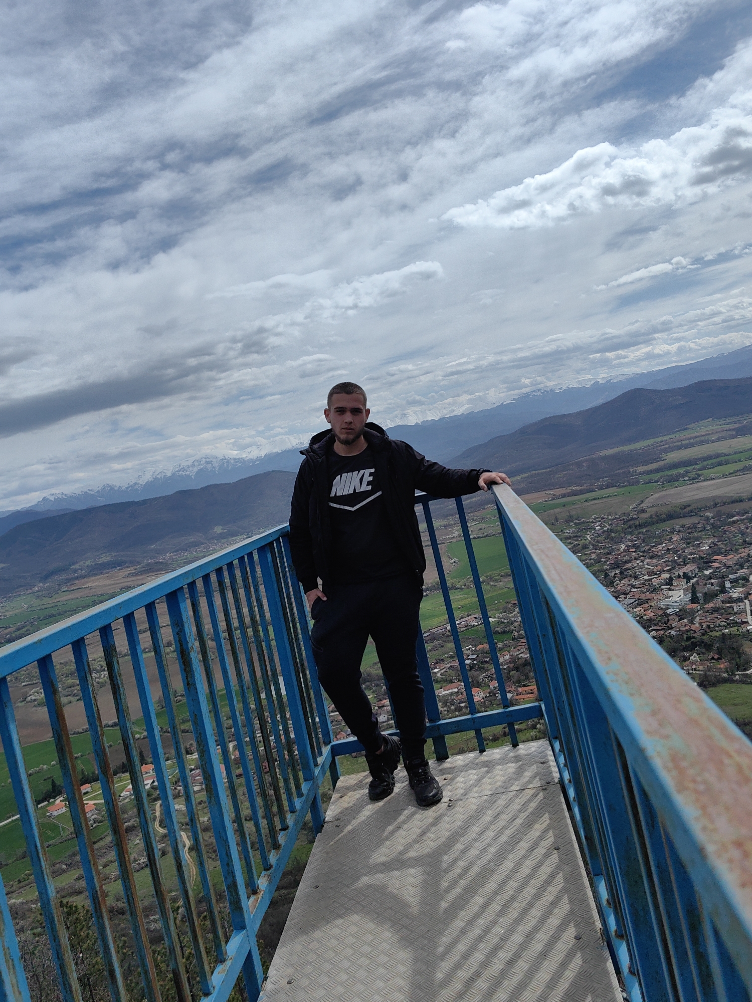 A medium shot features a young man on an observation platform, seemingly a tourist enjoying a scenic view in Vrabevo, Bulgaria. The man is dressed in black athletic wear, featuring a Nike hoodie, pants, and boots. He leans casually against the bright blue railing of the platform. Behind him, the landscape stretches out, encompassing rolling hills, distant mountains with snow-capped peaks, and a small village or town. The sky is overcast with clouds. The platform itself has a grated metal floor, and the railings are showing signs of rust.