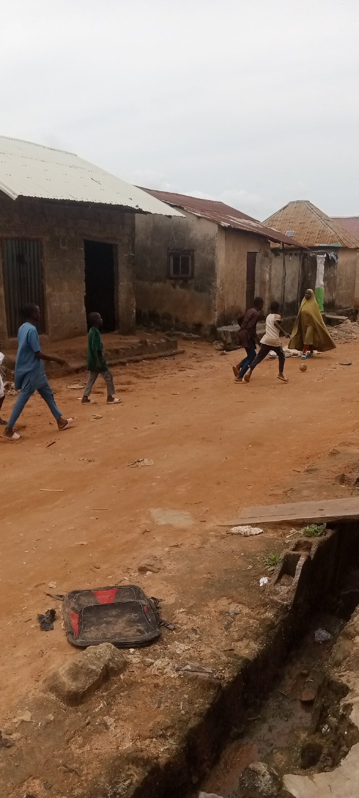 This image depicts a street scene in Kwamba, Nigeria, under an overcast sky. The ground consists of reddish-brown dirt, serving as an unpaved road. Several single-story buildings line the background, constructed with weathered concrete blocks and featuring corrugated metal roofs; some roofs are silver, others exhibit rust. One building on the left has a corrugated metal door and another building centrally located features an open doorway and a small rectangular window. A smaller, darker solar panel is visible on a distant roof. Six individuals are present. In the left mid-ground, a person wearing a blue tunic and trousers walks left, while another person in a green shirt and grey trousers follows. To the right of center, two individuals are engaged in playing football with a deflated or partially deflated brown ball on the ground; one wears a brown top and dark trousers, the other a white top and dark trousers, both in motion towards the ball. Further right, a person in a full-length olive-colored abaya or hijab stands, facing right, near the buildings. A sixth person is partially visible behind the first blue-clad individual. In the lower left foreground, a black and red soft-sided bag or backpack lies flat on the dirt. A concrete-lined drainage ditch or trench runs along the right side of the foreground, partially spanned by a wooden plank. Scattered debris and litter are visible on the ground and within the ditch.