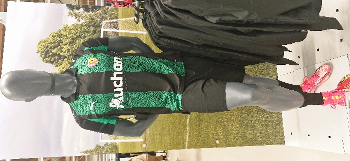 The scene depicts an interior retail environment, likely within an Auchan hypermarket in Vendin-le-Vieil, France. A full-body, dark gray mannequin stands centrally on a white floor platform marked with small black squares. The mannequin is dressed in a black and green striped short-sleeve soccer jersey featuring a white "Auchan" logo with a bird icon on the chest, a white Puma logo on the right chest, and a multi-colored shield-shaped crest on the left chest. It also wears black shorts, black socks, and bright pink and yellow patterned soccer cleats. A small black rectangular security tag or electronic device is clipped to the right side of the mannequin's jersey. Behind the mannequin is a large vertical backdrop displaying an image of a green soccer field with a white goal and distant trees under a light sky. To the right of the mannequin, a clothing rack holds multiple dark-colored garments, appearing to be jackets or tracksuits. In the blurred background on the left, a person is partially visible, wearing light-colored upper attire and brown lower garments, walking away from the camera.