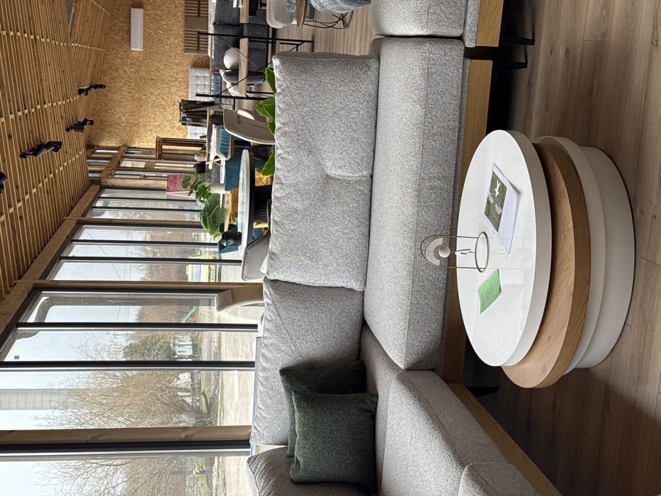 The image depicts the interior of a modern furniture showroom or store located in Bozhurishte, Bulgaria. The view is predominantly from a low angle, focusing on a display area. In the immediate foreground, a light grey modular sectional sofa with dark green throw pillows is arranged. The sofa features visible wooden base elements and dark, tapered legs. In front of the sofa, a set of three round, nested coffee tables is positioned. The top table is white and glossy, the middle table is natural wood, and the bottom table is white. On the top white table, a small metal decorative object with a spherical wooden element is present, alongside a green rectangular paper and a folded leaflet or magazine with an image on its visible page. The floor throughout the establishment consists of light-colored wooden planks. The establishment features a high ceiling with a slatted wooden finish, under which multiple black track lights are mounted. One interior wall is covered with a light-colored, textured paneling, possibly oriented strand board, with a white air conditioning unit installed high on it. The left and mid-sections of the image are dominated by large, floor-to-ceiling glass windows framed by wooden beams, allowing significant natural light. Through these windows, an exterior scene is visible under an overcast sky. Prominently visible is a tall, light-colored concrete silo structure in the distance. Bare deciduous trees are scattered across the landscape. Further into the distance, other buildings and what appears to be playground equipment are discernible. A yellow vehicle, resembling a small bus or van, is seen on a road outside. Within the showroom, beyond the foreground sofa, multiple furniture arrangements are visible. These include various dining tables with chairs (some upholstered in grey, beige, or yellow), a round black table with potted plants, and additional sofas and bed frames showcased in different settings. No individuals are present in the image.