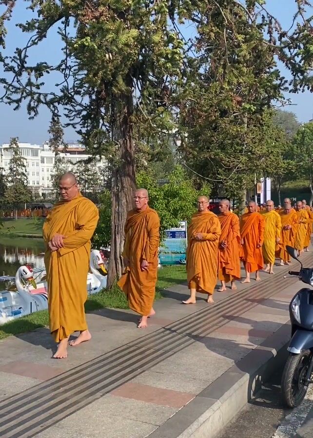 A line of barefoot Buddhist monks wearing orange robes walk along a paved path near a body of water and under trees on a sunny day. A gray motor scooter is parked on the sidewalk. The line of monks moves from left to right in the frame. Buildings are visible in the background.
