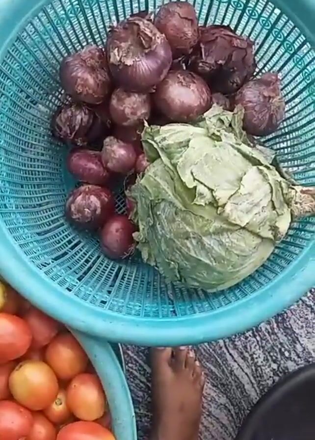 top-down view of two light-blue plastic baskets filled with produce. The first basket contains red onions and a head of cabbage. Some of the onions are slightly withered. The second basket is filled with red and yellow tomatoes. A person's foot is visible near the basket of tomatoes, wearing blue jeans. The background is a gray, textured surface.