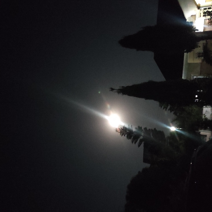 A nighttime scene is depicted in Jos, Nigeria. The dark sky dominates the upper portion of the frame, illuminated by a brilliant, white light source, likely the moon or a powerful streetlamp, positioned left of center. This light source exhibits a prominent, elongated lens flare extending diagonally upwards and to the right, along with a distinct smaller green lens flare artifact. Silhouetted against the sky and diffused light are several trees. On the far left, a tall, irregular tree form is visible. Towards the center-right, two prominent, dark, conical trees, possibly cypress or similar conifers, stand tall. Partial silhouettes of residential buildings are visible in the background, primarily on the right side, with some exterior or interior illumination discernible from a structure on the far right. The top of a dark object, possibly a vehicle, is present in the lower-left foreground. No individuals or specific actions are discernible. The atmosphere appears hazy, contributing to the light diffusion.