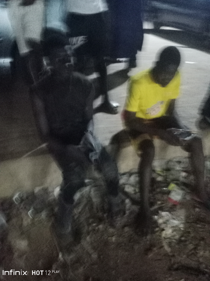 Two individuals are sitting on what appears to be debris on the ground. One person is wearing a dark-colored shirt and light-colored pants. The other person is wearing a yellow shirt and dark shorts. There are other people standing in the background, but they are blurry. The lighting suggests it is nighttime or a dimly lit environment. The image is blurry, and it is difficult to discern specific details.