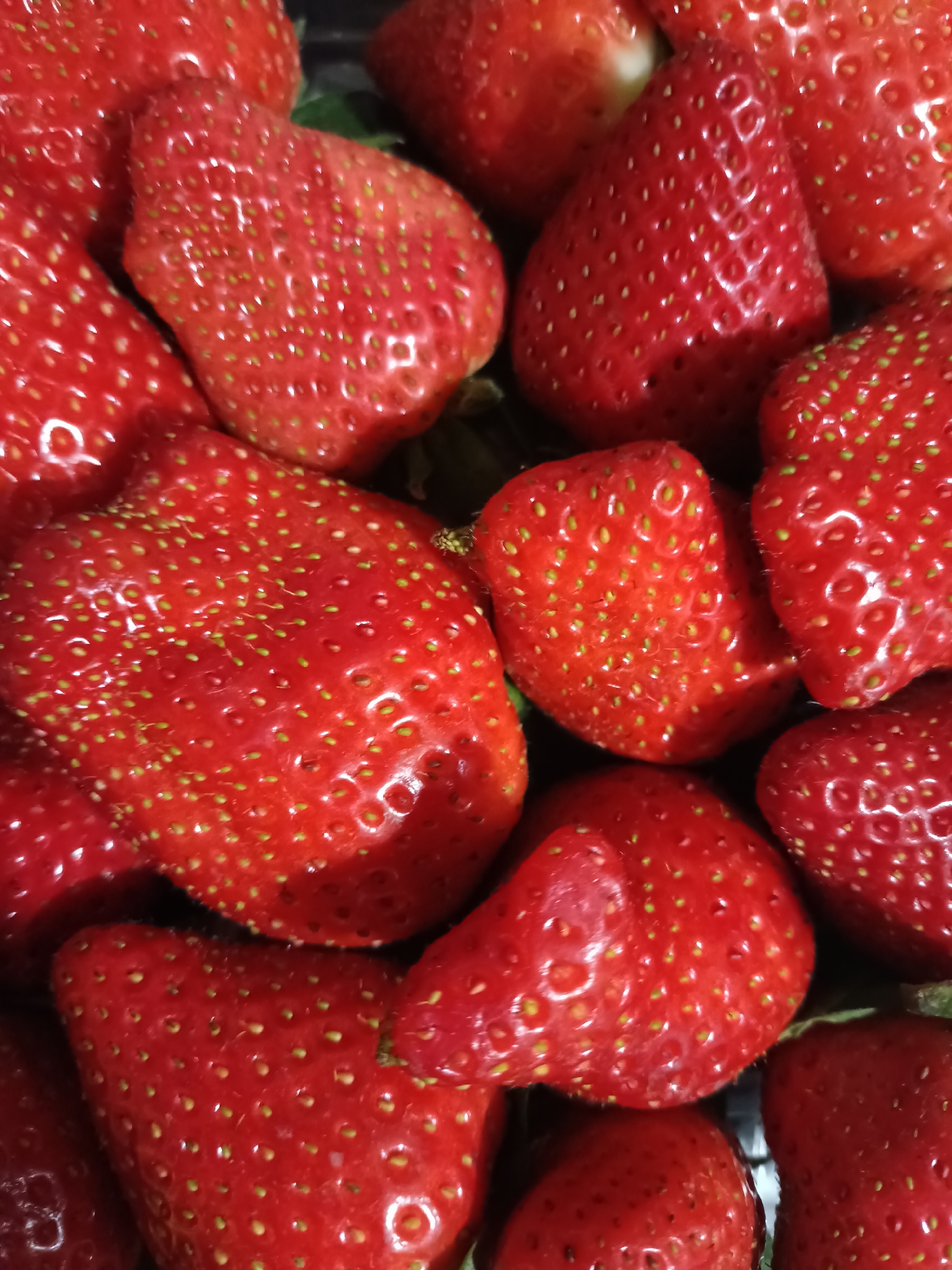 - "A close-up, high-angle view depicts a dense cluster of approximately twenty-five ripe, red strawberries" by FM-BdCXB3, licensed under CC BY 4.0