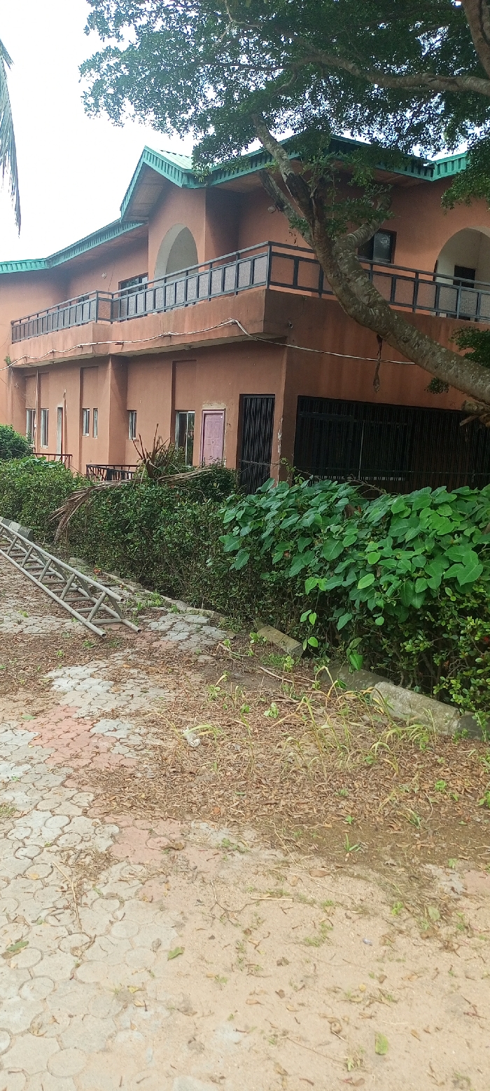 An exterior view in Ila Orangun, Nigeria, depicts a multi-story building with a reddish-brown facade and a green corrugated metal roof