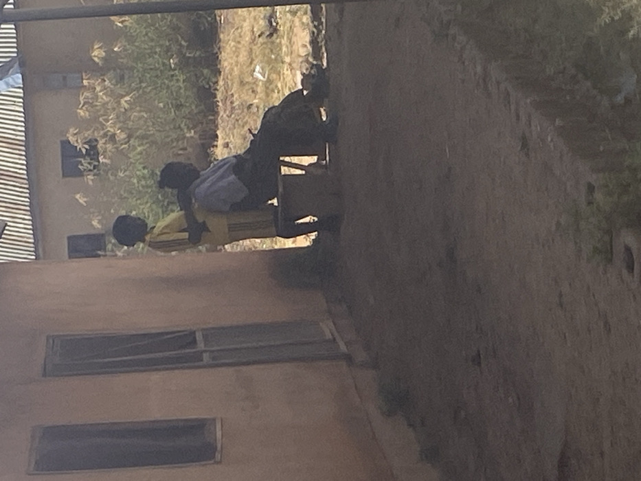 In Du, Nigeria, an outdoor haircutting scene unfolds next to a light brown building with two rectangular windows and a screen door