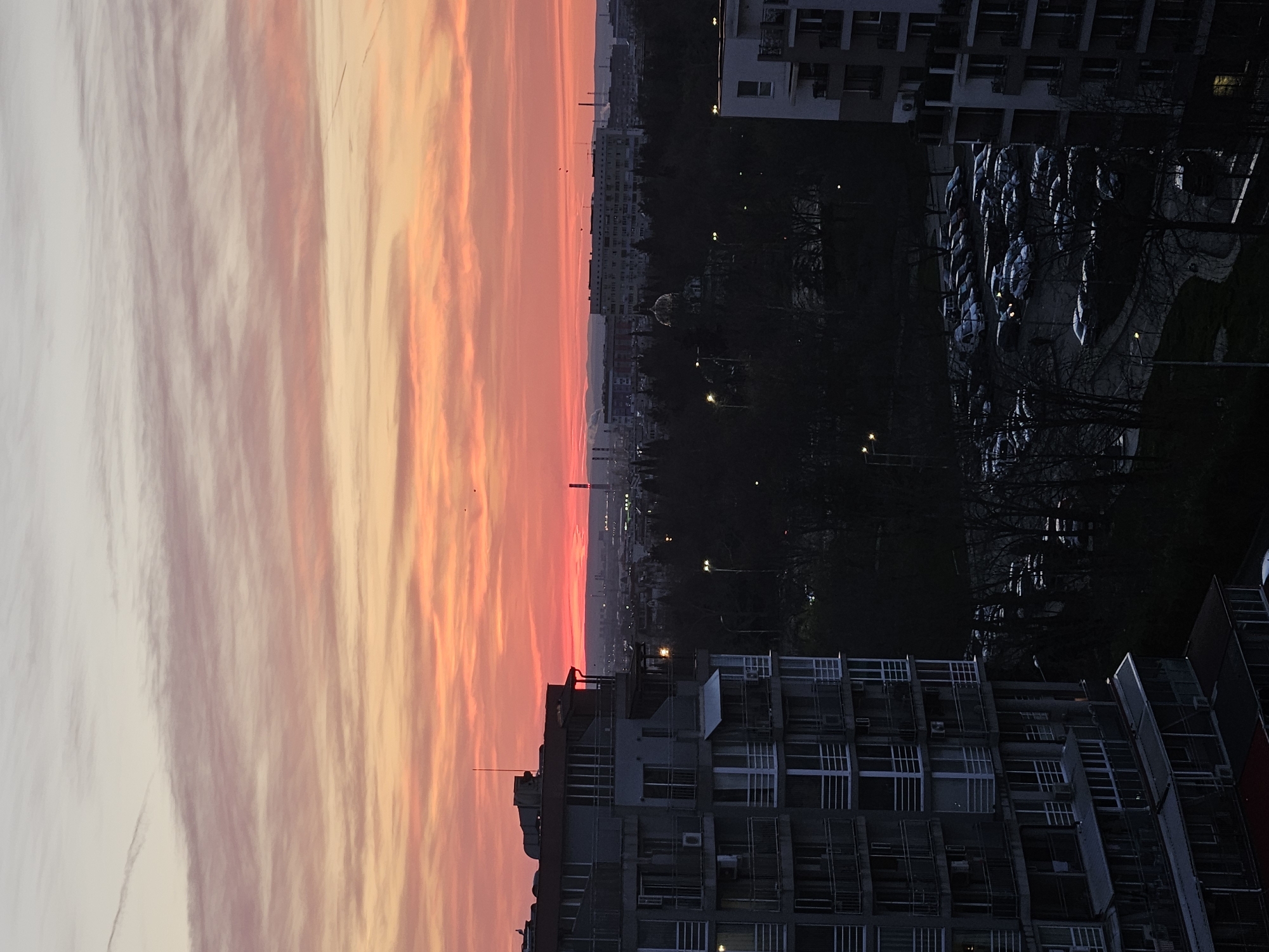 The image depicts a view of Burgas, Bulgaria, at sunset. The sky exhibits a gradient of colors, from pale pink to vivid orange. A cityscape stretches along the horizon with dim lights indicating a populated area. In the foreground, residential buildings are visible, with numerous windows. A parking area with rows of cars can be seen behind the buildings. The scene is partially obscured by trees.