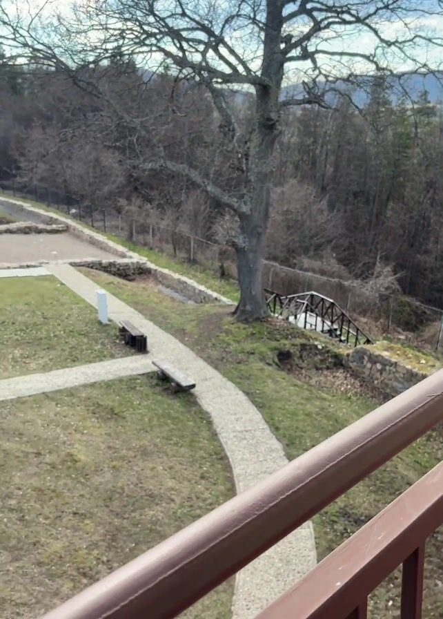 From a slightly elevated position behind a brown metal railing, the camera pans across a grassy, wooded area with stone pathways
