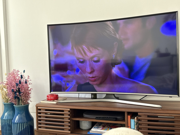 The scene depicts an interior room located in the city of Almada, Portugal. A large, curved, black-framed television screen is centrally positioned on a dark wooden media console. The television displays a medium shot of a woman with short, reddish-brown hair, seen from the chest up, looking downwards. She wears earrings, and her skin tone appears reddish-purple, consistent with screen lighting. A man, out of focus, is partially visible behind her to the right. The wooden media console features horizontal slatted panels on its left section and open shelving on its right. On the console's surface, to the left of the TV's stand, a red circular ashtray with white text, partially reading "on my fire," rests atop a stack of two books. To the left of the console, two identical ribbed teal-colored ceramic vases are present. The vase on the left holds beige dried plant stalks. The vase on the right contains pink dried plant material intermingled with dark blue dried flower heads. The wall behind these objects and the television is a plain, light-colored surface. A blurred, light-colored object is partially visible in the bottom right foreground.