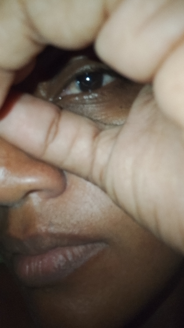 A close-up shot captures a person's face, with fingers obscuring most of it. Only one eye is visible, its pupil reflecting light. The nose and lips are also discernible. Skin tone is brown, and the image is somewhat blurry. The fingers framing the eye create a distorted perspective.