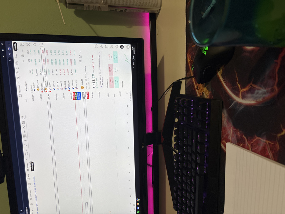 The image depicts a close-up, elevated view of a computer workstation located in Sofia, Bulgaria. The central object is a black LG monitor displaying a financial trading interface, specifically showing market charts and a watchlist for various currency pairs and commodities like Gold (XAUUSD) and Silver. The Gold price is prominently displayed at 4,412.525 USD, indicating a recent drop. The screen's bottom right corner shows the date and time as 21:38, March 25, 2020. Pink LED backlighting is visible beneath the monitor. A black mechanical keyboard with purple backlit keys rests directly in front of the monitor. To its right, a black Razer gaming mouse with a green illuminated logo sits on a large mouse pad featuring a red and orange abstract, fiery design. A small, white, spiral-bound notepad with ruled lines is partially visible on the left side of the mouse pad. On the right, a translucent blue-green glass containing a light green liquid is partially visible and out of focus. A white aerosol can, possibly for cleaning, stands on the desk to the far right, adjacent to the monitor, against a light green wall. No individuals are present in the scene.