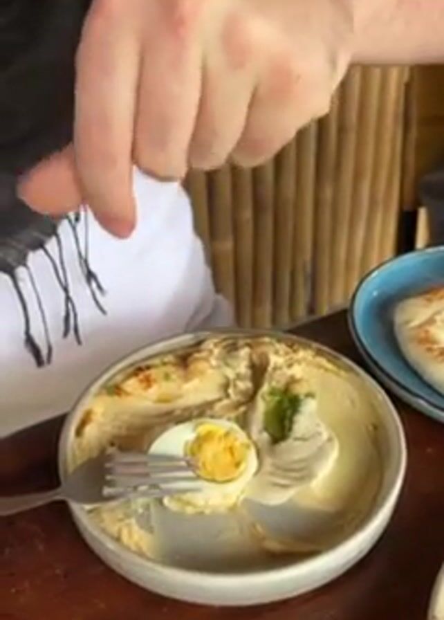 A person wearing a white t-shirt with a black scarf around their neck sits at a wooden table. They use their fingers to add a pinch of a red powder to a plate of hummus with a halved hard-boiled egg. A fork rests on the plate. A blue plate with what looks like pita bread is to the right of the hummus. A bamboo-like wall is in the background.