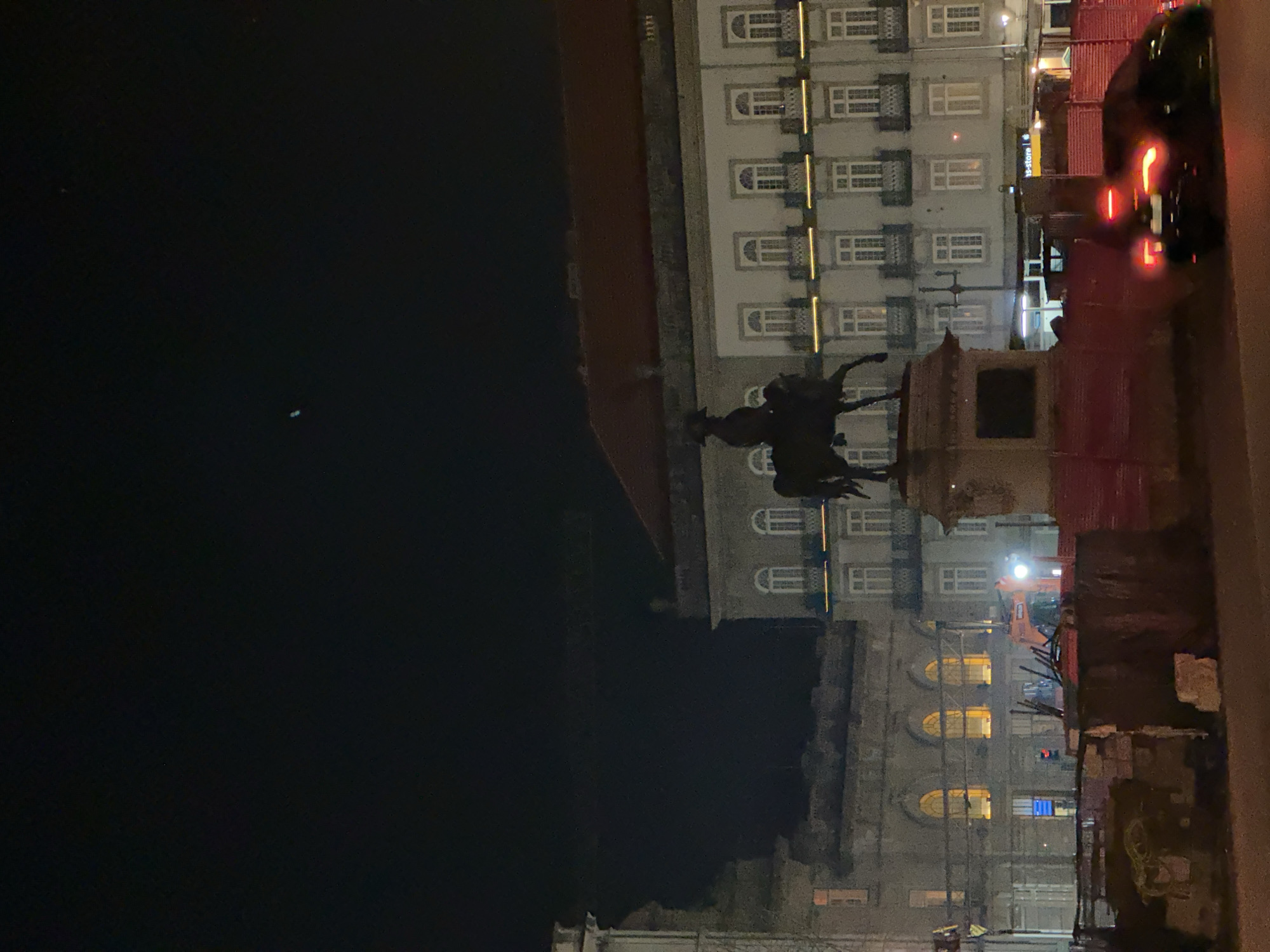The image depicts Praça da Liberdade in Porto, Portugal, at night. Dominating the mid-ground center is the dark silhouette of the equestrian statue of King Peter IV, mounted on a light-colored plinth. Behind the statue, a large, multi-story building with a red-tiled roof and numerous regularly spaced windows featuring white frames and dark balconies is illuminated. Yellow string lights are strung across several balcony railings. To the left of the statue, another stone-colored building exhibits arched windows on its visible lower floors, with several interior lights casting a warm yellow glow. The foreground features various elements indicative of construction. Red-orange temporary barriers partially enclose an area containing stacked concrete blocks or rubble. Further left, an orange excavator is visible, illuminated by a bright white headlamp, positioned within what appears to be a work zone. On the far right, a dark-colored vehicle, likely a car, is in motion, evidenced by the blurred streaks of its red taillights. The sky above is dark, with a faint, thin crescent shape, possibly the moon, visible near the top center. Artificial lighting from buildings and streetlights illuminates the scene. No discernible individuals are present on foot.