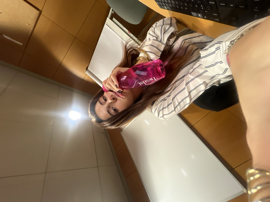 A woman with brown hair and black nails holds a pink water bottle with the word "healst" printed on it. She wears a white shirt with black stripes, gold bracelets, and rings. A keyboard is visible in the upper right corner. The background consists of a white board, a desk, and a chair. The image is taken from a low angle, creating a distorted perspective.