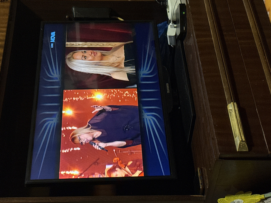 The image displays an indoor scene in Sarnevo, Bulgaria, featuring a flat-screen television on a dark wooden dresser. The Telefunken television screen shows a split-screen broadcast from "LIVE NOVA." The left panel depicts a blonde-haired woman wearing glasses and a dark, sheer top, actively singing into a microphone with her left hand raised, against a red background with illuminated vertical lines. A partially visible young person playing a string instrument is also seen behind her. The right panel shows a young woman with long blonde hair and a dark, off-the-shoulder top, looking slightly to her left with a faint smile, against a red curtain background. On the dresser, a dark smartphone rests to the left of the television's stand, and a black media box with a green indicator light, connected to a white power adapter, is positioned to the right. The dark wooden dresser features at least two drawers, each with a long, horizontal gold-colored handle. A yellow object is partially visible in the bottom-left corner of the frame.