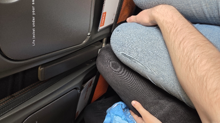 The image depicts the interior of a commercial aircraft cabin, specifically an EasyJet flight, at an unknown geographical location