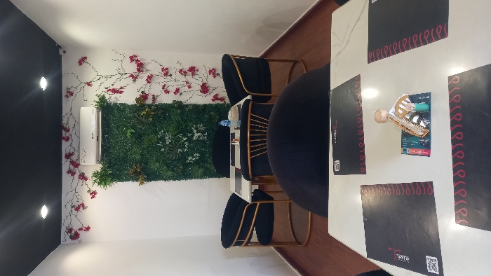 This image depicts the interior dining area of an establishment located in Gwarinpa, Nigeria. The room features white walls and a black ceiling with two active recessed downlights. The flooring is a reddish-brown wood laminate, bordered by a matching skirting board. On the back wall, a rectangular artificial green plant panel is centrally mounted. Above this panel, a white LG split-unit air conditioner is installed. Artificial red flowering vines with dark stems are arranged across the white walls, extending from the area around the green panel. Two white rectangular tables are present. The table in the foreground, partially visible, is set with four black placemats, each featuring a red patterned border; one placemat prominently displays "TAHTA" text and a QR code. A small decorative item, resembling a wooden figurine of a chef or waiter holding a tray, is positioned on this table, accompanied by miniature colorful objects at its base. The background table is fully visible, encircled by black upholstered chairs. Two chairs on the left side have distinctive golden metallic circular frames, while two chairs on the right feature dark frames with prominent backrest designs. A clear plastic bottle of water and two black placemats are visible on the background table. No individuals are present in the scene.