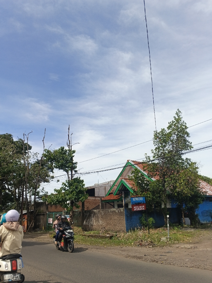 A street view shows two motorbikes on a road with a blue and white sky above. A house with a red roof and green trim stands to the right, partially obscured by a tree. The house has a blue sign in front. Trees and a wall line the opposite side of the road, and a building is under construction in the background. Overhead power lines stretch across the sky.