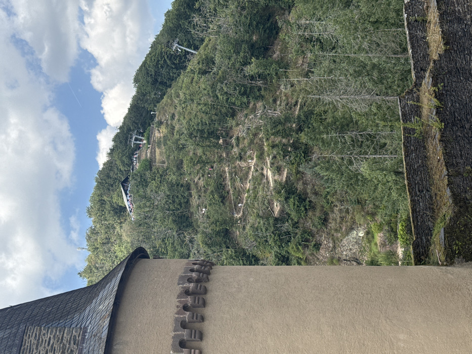 The image captures a daytime scene in Vianden, Luxembourg, specifically featuring a view from Vianden Castle towards the adjacent hillside. In the immediate foreground on the left, a portion of a light-brown, cylindrical stone tower with a dark, conical, tiled roof is prominently displayed. Below the roofline, a decorative band of darker, stylized corbels is visible. To the right and extending into the background is a steep, heavily wooded hillside. A Vianden chairlift system ascends the hill, with multiple white support pylons visible along the slope. At the summit, a dark-roofed building, consistent with the upper station and a restaurant, is discernable, surrounded by a cluster of small human figures. Numerous other human figures are visible as small white specks walking along a series of visible switchback dirt paths that crisscross the hillside. The hillside vegetation consists primarily of dense green deciduous trees, interspersed with some coniferous trees, particularly toward the lower right, where some appear sparsely foliated or dead. In the lower right foreground, a section of an old, dark stone wall, possibly part of the castle's outer defenses, is present, topped with sparse green vegetation. The sky above is blue with scattered white cumulus clouds, and a faint contrail is visible in the upper right quadrant.