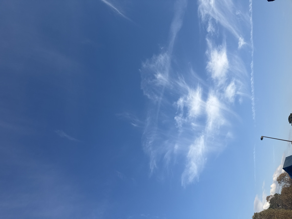 A bright blue sky fills most of the frame, transitioning to a lighter shade towards the right. Cirrus clouds, appearing as wispy strokes, are concentrated in the upper-right quadrant, suggesting a dynamic weather pattern. A faint contrail is also visible on the right. A glimpse of building structure, utility pole, and foliage is visible at the bottom right.