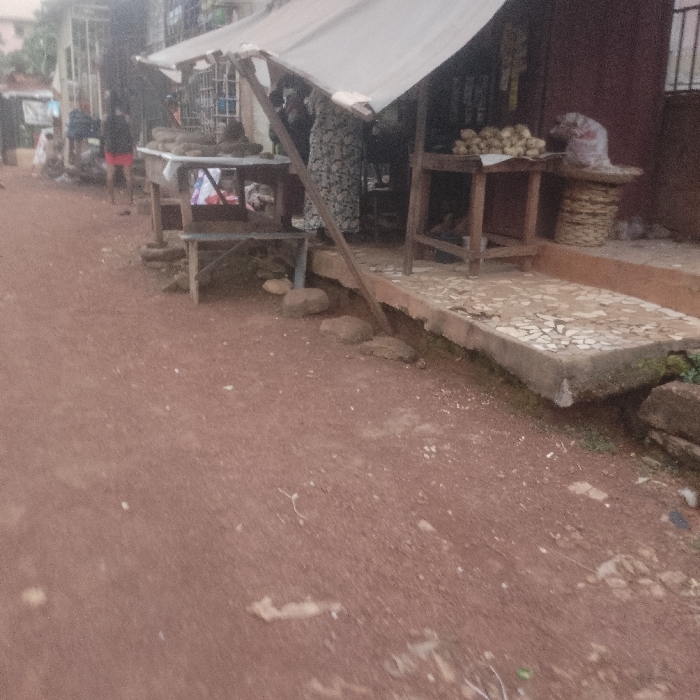 A street scene in the city of Unknown, Unknown, depicts a commercial area adjacent to a reddish-brown dirt road. On the right, a raised concrete platform, approximately 0.2 meters high, features a surface of fragmented light-colored tiles. Two vendor stalls operate on this platform, each shaded by a light-colored fabric awning secured to an unseen building structure. The left stall consists of a wooden table displaying dark, lumpy items. A dark-clothed individual stands behind it. Stones are placed at the base of the table and along the platform's edge. Further down the dirt road to the left, several indistinct human figures are visible, one wearing red shorts. The right stall features a wooden table piled with light-colored, round produce. A person in a patterned dress is partially visible behind this stall. To its right, a cylindrical woven basket holds a white bag. The background consists of multiple obscured building facades. The scene is illuminated by diffused daylight.