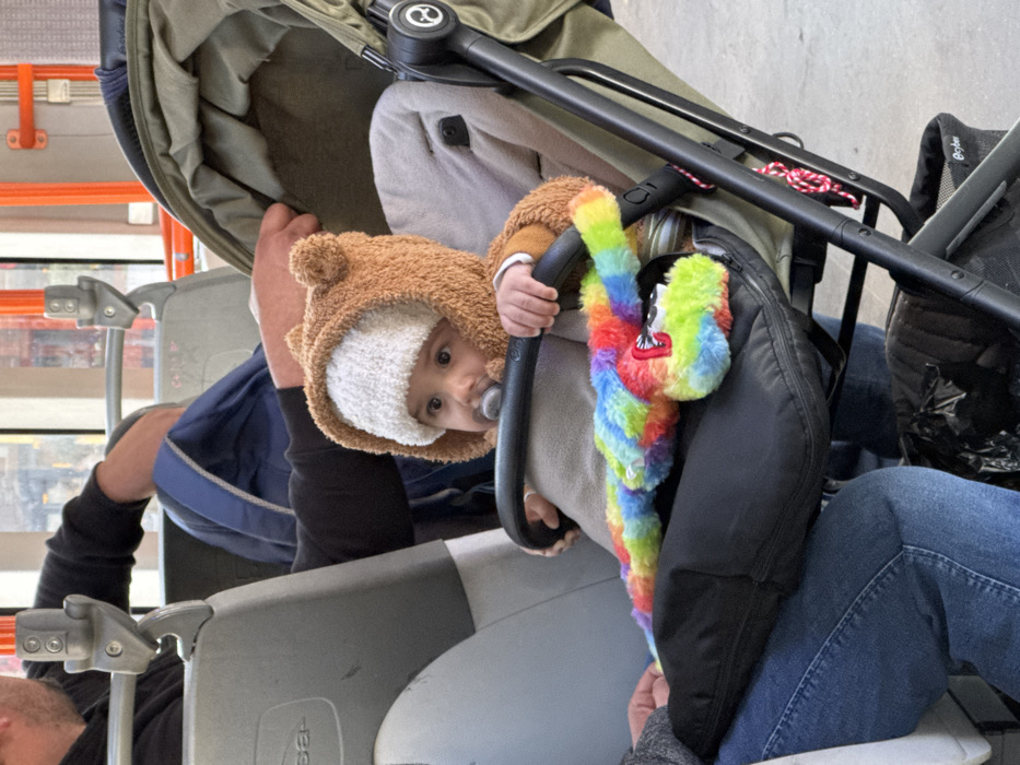- "An infant is seated in a black and olive green Cybex stroller within a public transport vehicle in Sofia, Bulgaria" by FM-cYgzB3, licensed under CC BY 4.0