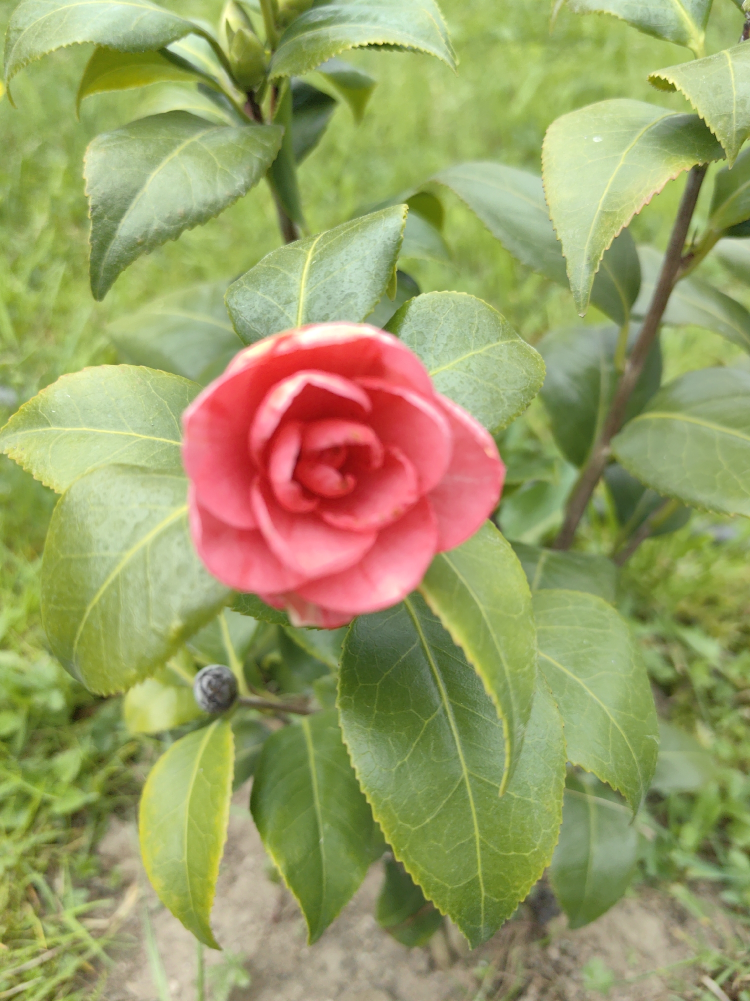 A close-up of a red camellia flower in partial bloom is centered in the frame, surrounded by glossy, green leaves. The plant appears to be outdoors in a garden or natural environment, as suggested by the ground and grass visible in the background. The focus is on the flower and immediate foliage, while the background is slightly blurred. There is no indication of the location of the image being Slatina, Bulgaria. There are no people visible in the image.