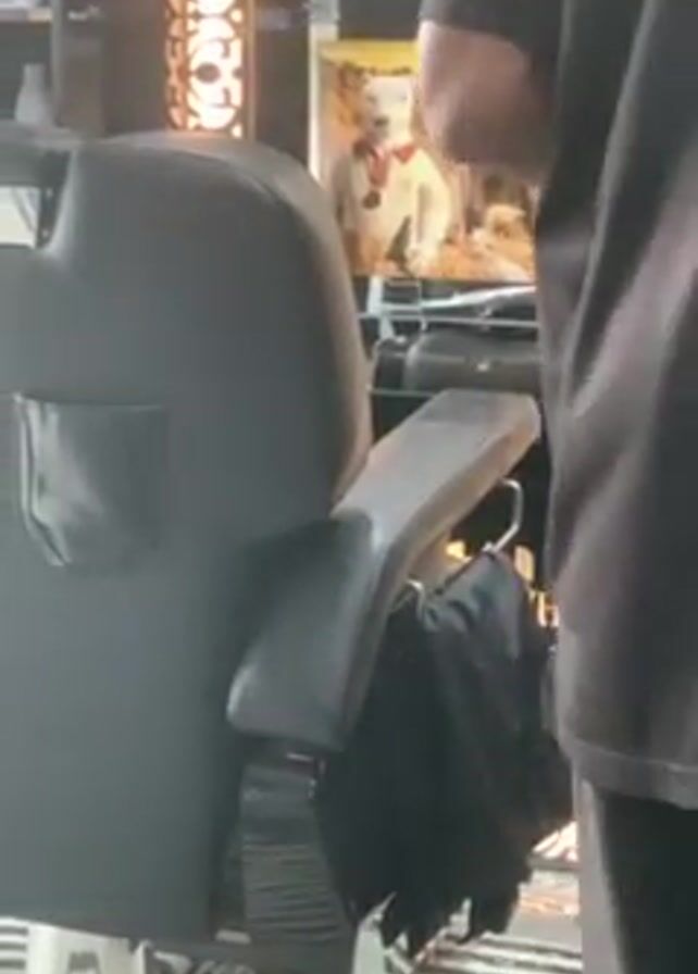 - "A person in a black shirt prepares a black barber's chair by placing a black barber's cape on the arm of the chair" by FM-DzLhy1, licensed under CC BY 4.0