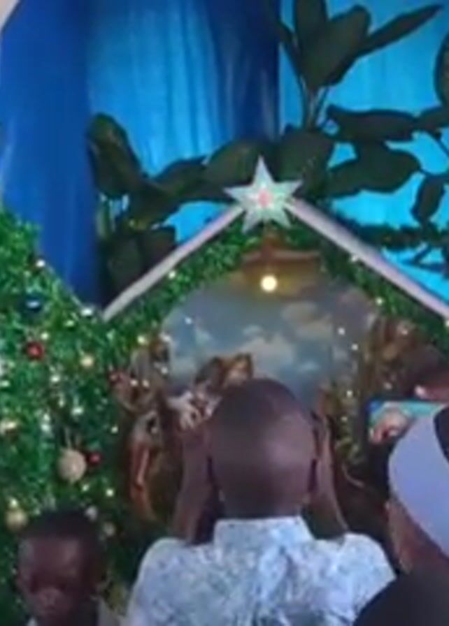 A group of people, mostly children, gather around a nativity scene. The scene is decorated with a star, Christmas trees, and blue netting. Some people are taking pictures with their phones. The scene is indoors, likely in a church or community center.