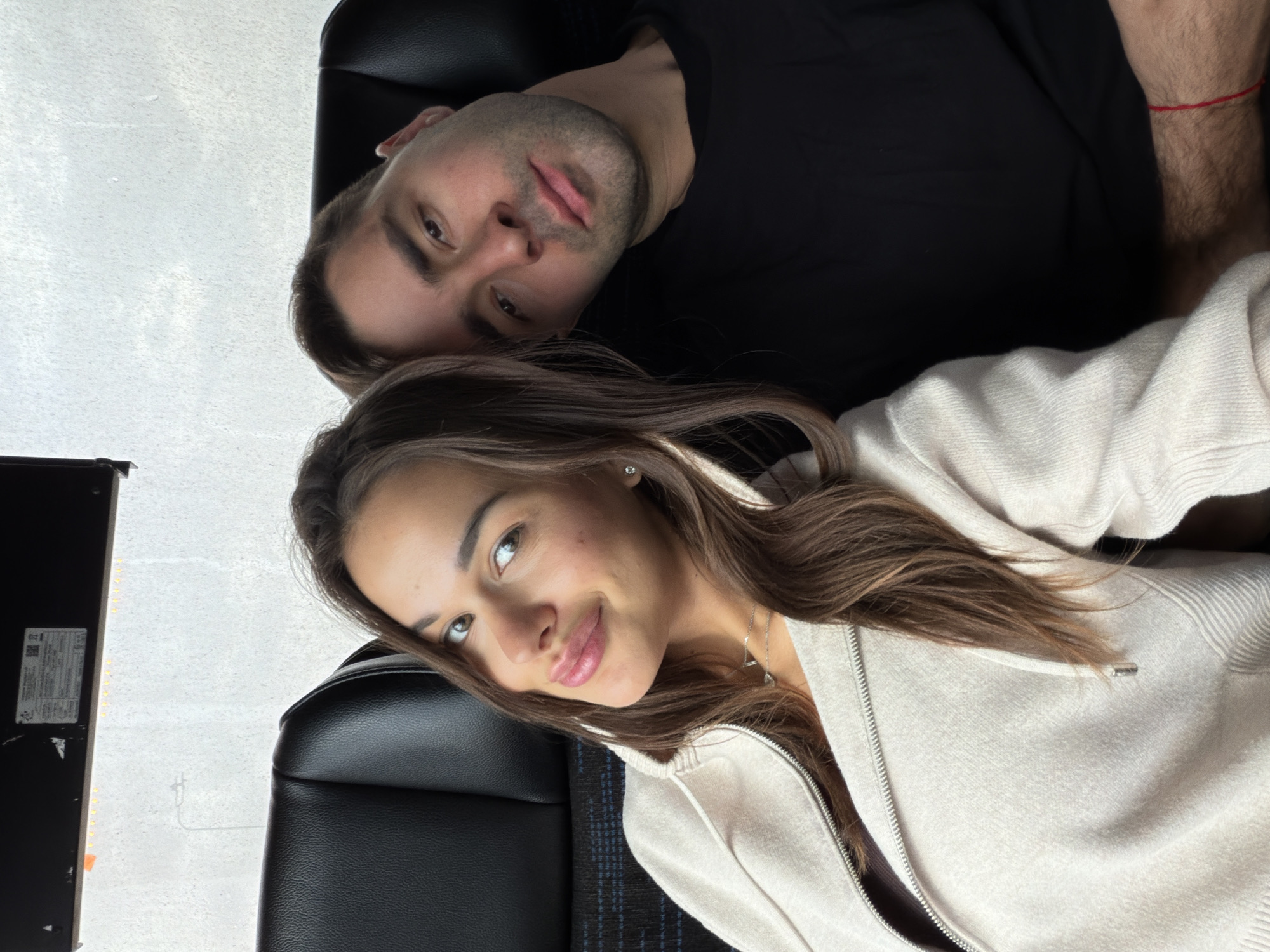 The image depicts two individuals, a female and a male, seated side-by-side within what appears to be the interior of a vehicle, likely a bus or train. The female, positioned on the left and closer to the camera, has long brown hair, brown eyes, and a fair complexion, exhibiting a faint smile. She is wearing a light beige zippered hooded top over a darker garment and two silver necklaces. The male, on the right, possesses short brown hair, stubble, and brown eyes, maintaining a neutral expression. He is wearing a black long-sleeved shirt, and a thin red string is visible on his right wrist. The male's head rests gently against the female's head/shoulder area. Both individuals are looking directly forward, towards the camera. They are seated in black, presumably leather, passenger seats. The background consists of a blurred vehicle window, revealing a pale, overcast outdoor environment with the faint outline of a street light pole visible to the left. An overhead black panel with white labels is visible at the top of the frame. The precise location within Tamar Regional Council, Israel, cannot be determined from the visual information presented in this image.