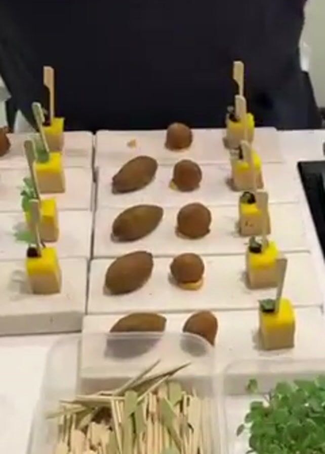 A chef in a white coat and black apron is arranging canapés on a white countertop. The canapés are arranged on small white tiles and consist of three different items: small cubes of yellow food skewered with sticks and topped with a small green garnish, small fried round balls, and larger oval-shaped fried items. The chef is using a small spatula to place the oval-shaped items on the tiles. Next to the tiles are containers of microgreens and bamboo skewers. A silver tray with more of the fried items is in the background. A bottle is visible on the left side of the frame. The setting appears to be a professional kitchen.