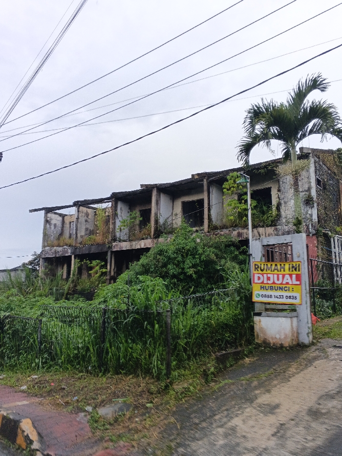 An abandoned, two-story concrete building overrun with greenery sits under a cloudy sky. Vegetation obscures much of the lower level. A large palm tree grows from the top floor. A for-sale sign, reading "RUMAH INI DIJUAL HUBUNGI: 0858 1433 0835", is posted near the entrance. An overgrown fence partially surrounds the property, and power lines are visible above. A section of a dark-colored paved road is in the foreground.