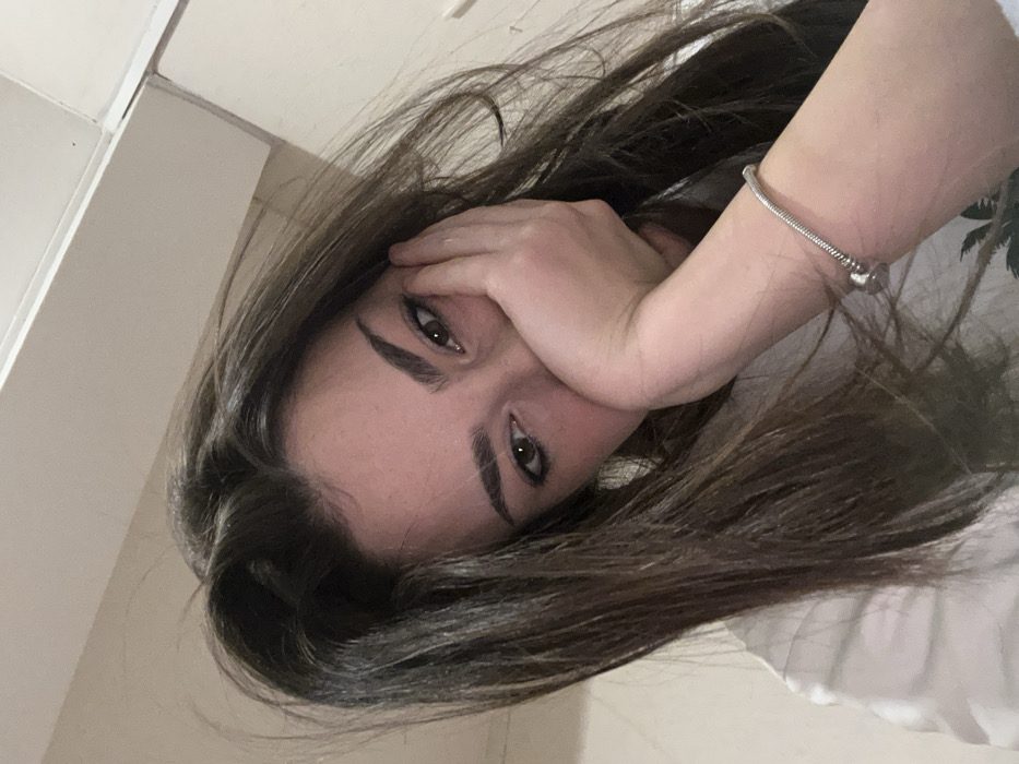 A woman with long brown hair partially covers her face with her hand. Her eyes, framed by dark eyebrows, are visible. She wears a silver bracelet on her wrist. Part of her white shirt is visible, and the background is a neutral wall. The perspective is angled, giving a casual, selfie-like feel.