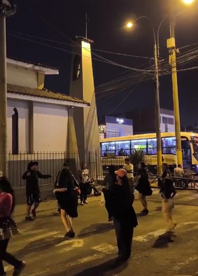 At night, a group of people are dancing in the middle of a crosswalk in front of a church. Most of the dancers are wearing dark-colored clothing, while a few are wearing brighter colored outfits. A large yellow bus is visible in the background, and there is street lighting illuminating the scene. The environment is urban, with power lines and buildings lining the street. The camera is at street level, capturing the dance performance directly.
