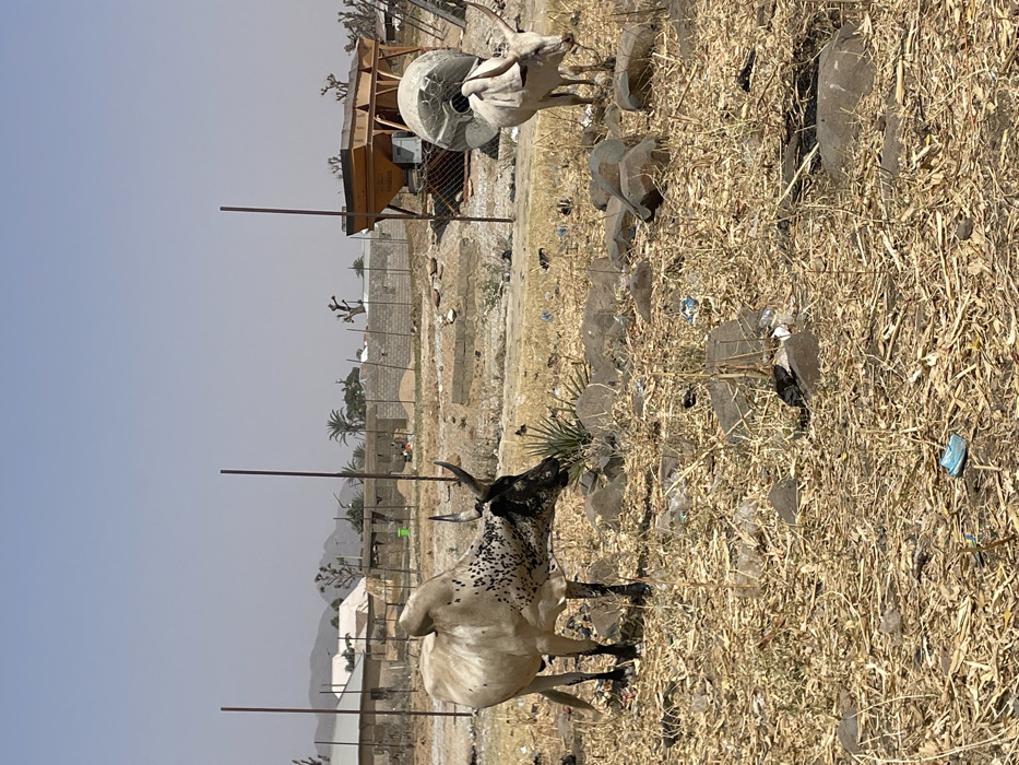 The image captures an arid outdoor environment within the city of Mara, Nigeria, under a clear sky. The ground in the foreground and midground is covered extensively with dry, light-colored vegetation, interspersed with numerous rocks and considerable litter, including plastic bottles and wrappers. Two bovines are the primary subjects. On the left, a large, light-colored bovine with a distinct dorsal hump features prominent black spots across its head, neck, and lower legs, and possesses curved dark horns. It is depicted with its head lowered, appearing to graze on a small green plant. To its right, a smaller, predominantly white bovine with long, curved horns stands with its head also lowered towards the ground. In the midground, two slender, dark metal poles rise vertically. The background reveals signs of human settlement and construction. Multiple buildings with light-colored roofs are visible, some appearing complete while others feature exposed concrete block walls and piles of sand, indicating ongoing development. To the far right in the background, a large, yellow, elevated industrial-style structure, resembling a hopper or feeder, stands next to a large, gray concrete cylinder lying on its side. Sparse trees and distant, hazy hills are visible on the horizon.