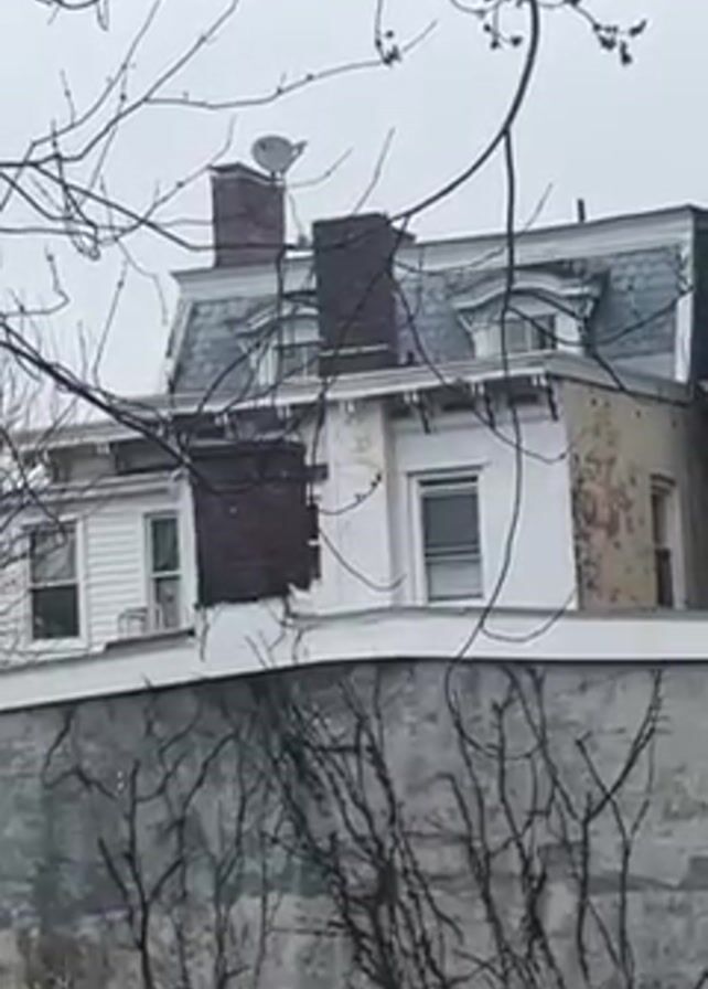 distant view of the upper stories of a house. The house is multi-storied, with a gray slate roof and several dormer windows. There are two brick chimneys visible, one topped with a satellite dish. The exterior paint is peeling in places, revealing layers of different colors beneath. The house is situated atop a high, weathered concrete wall, which is covered in climbing vines. In the foreground, bare tree branches partially obscure the view. The sky is overcast, contributing to a muted color palette. The video appears to be taken from a stationary position.